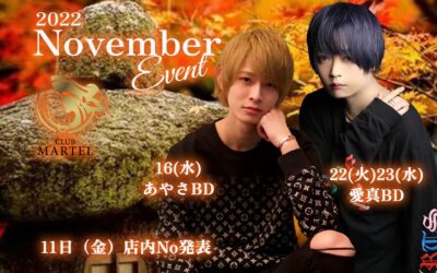 2022.11.5 キャストブログお知らせショップブログマーテル|CLUB MARTEL(FC店)レイ日記 本日もご来店ありがとうございます😊 かなり寒くなってきたので皆さんマーテルでイケメンに囲まれながら心も体もホットになっちゃいましょう❤️ 22日…